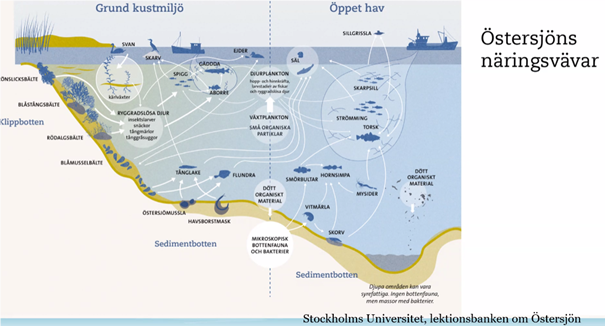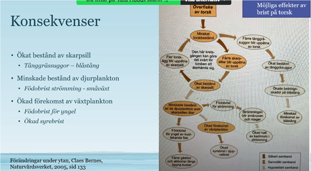 När torsken minskar ökar pigg/skarpsill. Dessa äter djurplankton och då ökar växtplankton. Detta leder tillsammans med övergödning till algblomning och bottendöd.